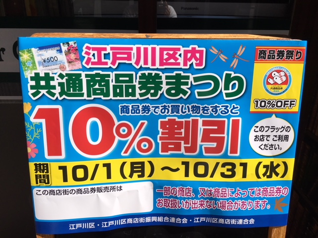 10/1~10/31までの期間中、江戸川区共通商品券を使ってお買い物すると10%お得にお買い物ができるというものです。