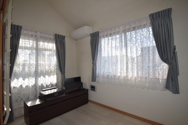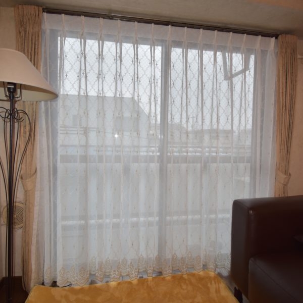 採寸時にこちらのレースカーテンをお持ちしお客様がとても気に入って下さり、5部屋全てこのレースを採用して下さいました。ドレープカーテンはグレーのシャンタン生地で、シックに抑えています。朝、ドレープカーテンを開けるのが楽しみなレースカーテンです!