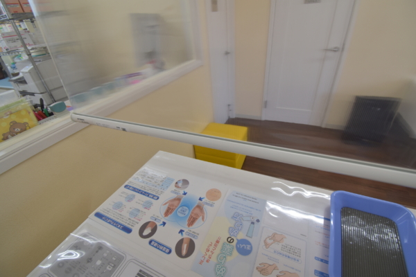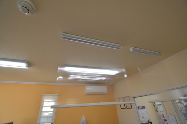さて、その感染症予防対策として調剤薬局様に透明ロールスクリーンをお取り付けさせて頂きました。