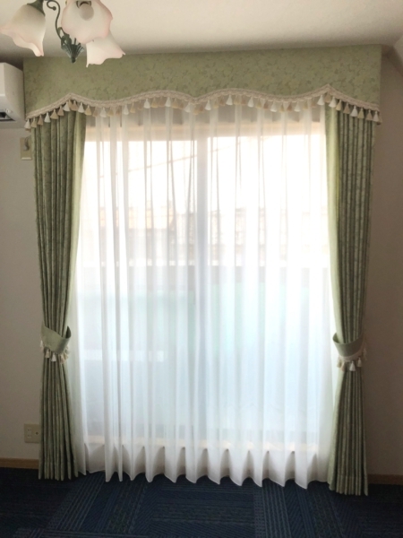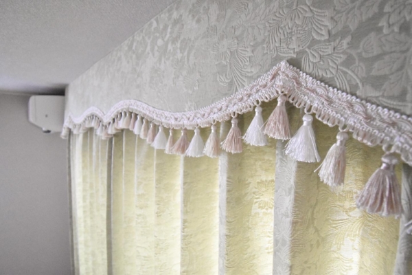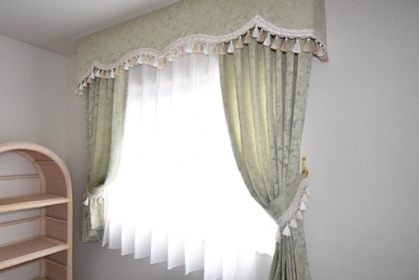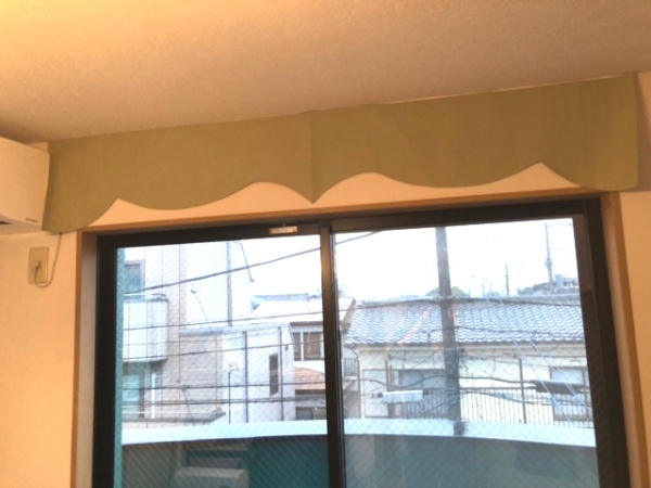 カーテンにフラットバランスをお取り付けたスタイルを施工させていただきました。「お祖母ちゃんのお部屋を上飾りを付けて素敵にしてあげたい」と一緒に住むお孫さんからのご依頼です。