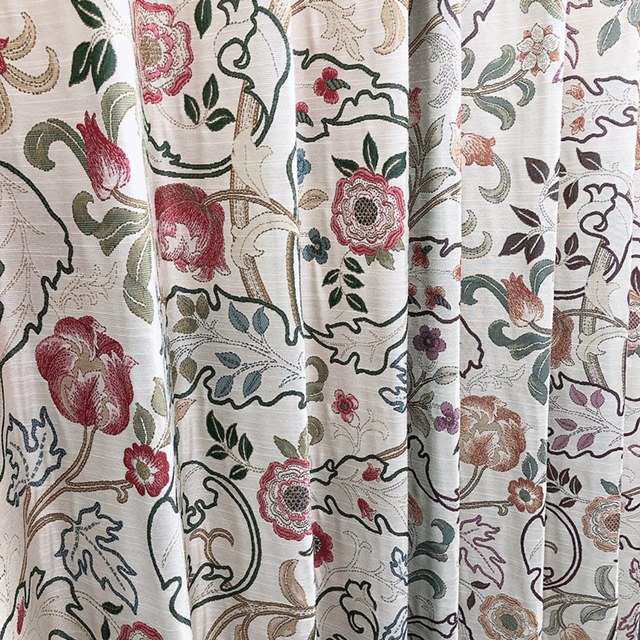 ウィリアム・モリスの次女メイが、別荘「ケルムスコット・マナー」で使われていたベッド掛けをヒントに、刺繍で表現したデザインを織物にしました。同じ色調の中でも柄がより引き立つよう、ゴブラン織りの手法を参考に、立体感を生み出しました。