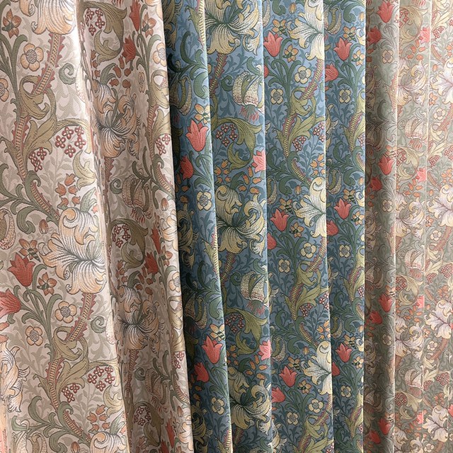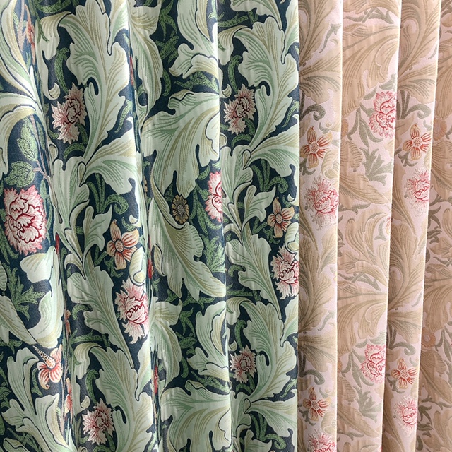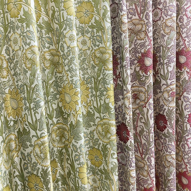 1893年にウィリアム・モリスによってデザインされた壁紙のデザインです。絡み合う曲線で描いたバラとカーネーションを、光沢のある糸で立体的に感じられるように織り上げ、コットンのようなナチュラルな風合いに仕上げました。「ピンク」とはカーネーションと同種であるナデシコの英名です。