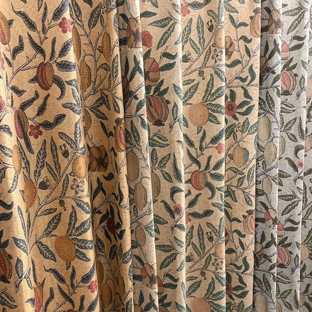 ウィリアム・モリスのデザインの中でも有名なこのフルーツの柄は、1864年にモリスが第二作目の壁紙として描いたもので、当時は版木を用いてハンドプリントされていました。版木の柔らかく味わいのあるタッチを織物で表現しています。