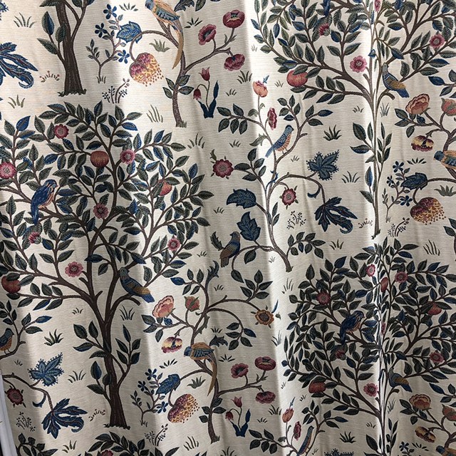 飛燕草をモチーフに1872年に制作されたウィリアム・モリスの壁紙のデザインを織物にしたものです。ざっくりとした地組織が、ナチュラルであたたかな表情を作り上げています。