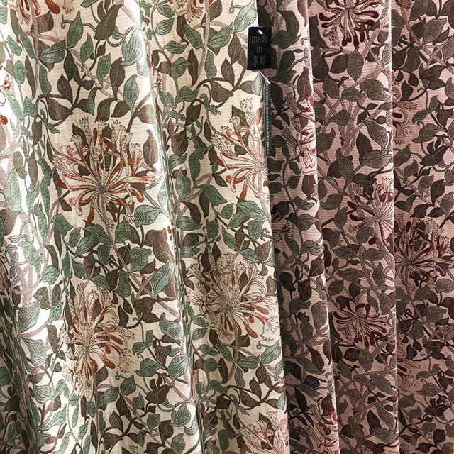 1883年にウィリアム・モリスの次女メイによって製作された壁紙のデザインを織物にしました。スイカズラのはながつる性の丸みのある細やかな葉の中に見え隠れするデザインです。色糸の交織が程よい深みを与えています。