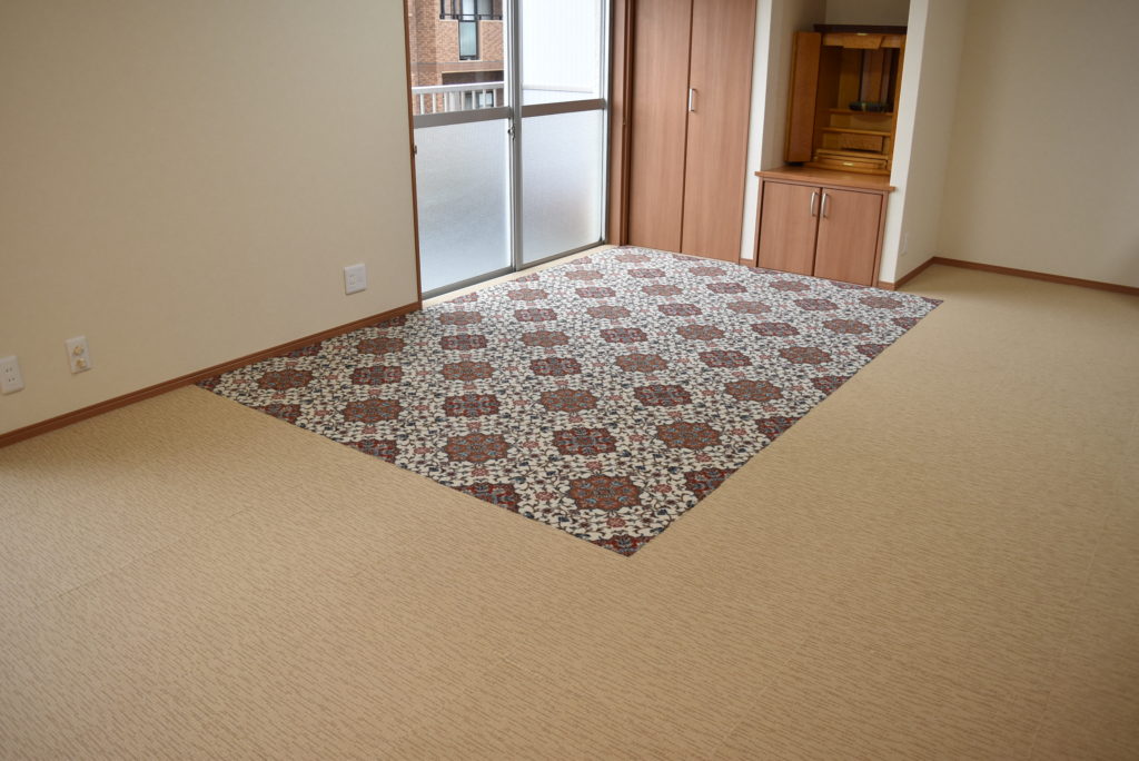 お仏壇の前だけ柄物にし、その周りは無地のタイプを敷いています。